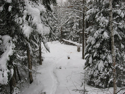 It's still possible to walk in the woods. It's quite a workout but worth it. Deer beds are everywhere and lots of little critters making tracks in the snow. Grouse season is still open but those birds like to bury themselves in the snow and you almost have to step on them in order to get them to fly. Then they blast out of the snow like a missile shot out of a submarine. Once one recovers from the near coronary, it's time to fire the shotgun, normally in a different direction than the bird is flying. Of course, since I now normally hunt by myself, I can always claim that I never shot.....